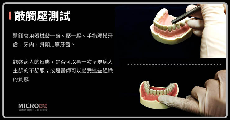 醫師會用器械敲一敲、壓一壓、手指觸摸牙齒、牙肉、骨頭…等牙齒,觀察病人的反應,是否可以再一次呈現病人主訴的不舒服;或是醫師可以感受這些組織的質感。