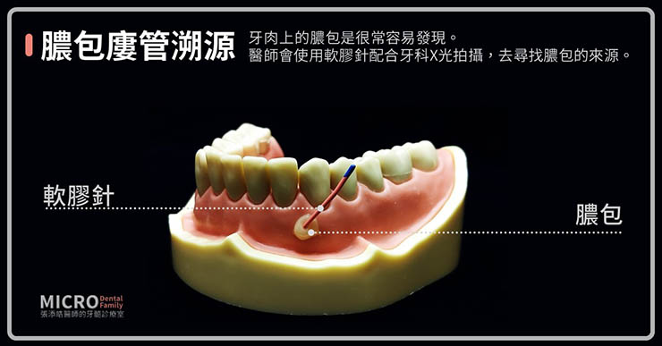牙肉上的膿包是很常容易發現的,醫師會使用定位軟膠針〈例如:馬來膠針〉,配合牙科X光拍攝,去尋找膿包的來源。然而偶爾在皮膚上一直都不會好的膿包,也有可能在尋找膿包來源時會發現來源其實是牙齒的原因。