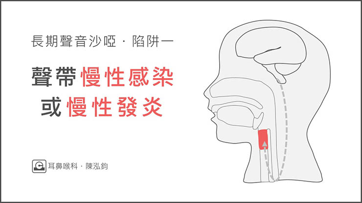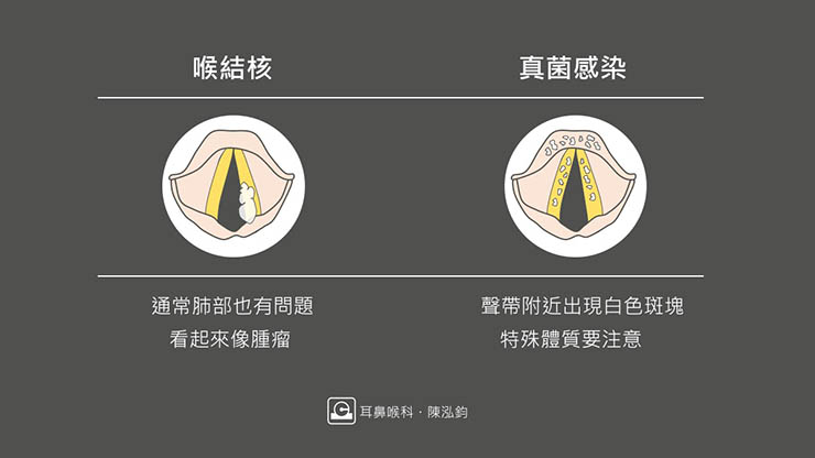 其他造成聲帶或喉嚨慢性感染的病菌,包括特殊體質要注意的真菌感染、梅毒…等等,雖然較少見,但這些都是面對長期沙啞的患者,耳鼻喉科醫師會列入考慮的。