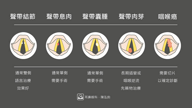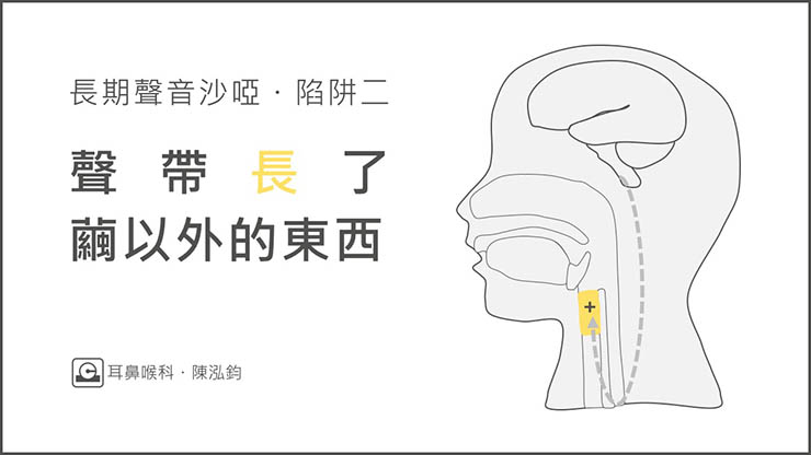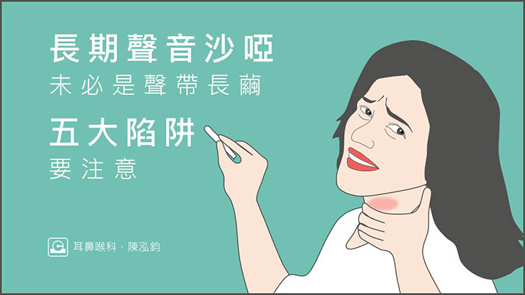 沒錯!聲帶長繭的確是常見的原因之一,但除此之外,還有族繁不及備載的原因會影響嗓音。在本文中,我將臨床上常遇到的狀況分類,整理出除了聲帶長繭以外,造成長期聲音沙啞的「五大陷阱」,並附上圖片,希望能讓您快速抓到這些病變的重點。
