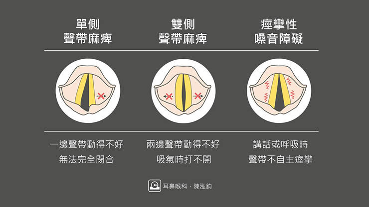 這對神經如果一邊出問題,稱為「單側聲帶麻痺」,說話時聲帶會關不緊,講話會漏風、氣音變得嚴重;吃東西時聲帶關不緊,食物可能嗆到氣管,影響進食。