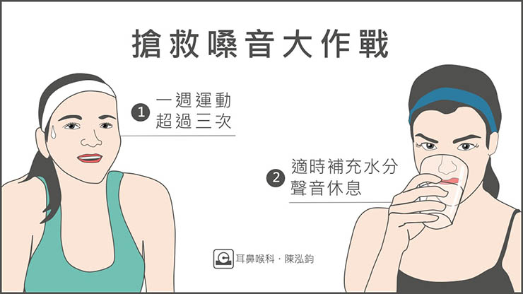 答:充足補充水分(實驗發現若老師沒喝水而講課,會增加 60% 聲音沙啞的機會;歌手水喝足搭配聲音休息,可以避免沙啞)、在吵雜的環境使用麥克風、避免過度使用嗓音、避免室內太乾燥、多運動(研究發現一週運動大於三次,可以降低沙啞的機率)。