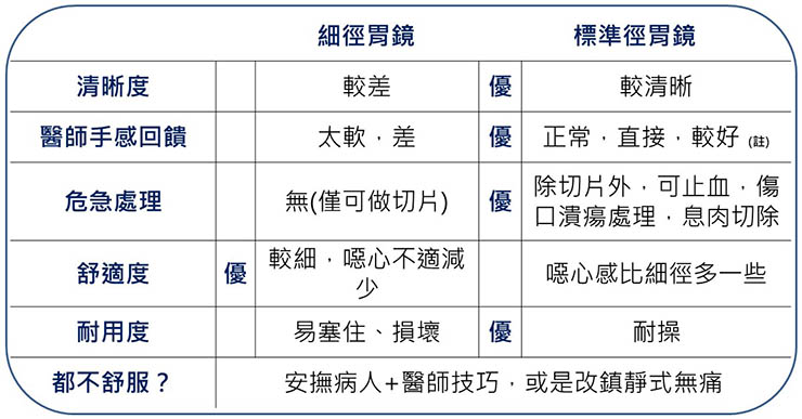 和目前標準徑的胃鏡相比,雖然細是他的優點。但,也因為細,管子較軟且容易塞住與損壞、解析度較差(看不清楚,品質受影響)、打氣較慢、胃酸抽取的功能較差。