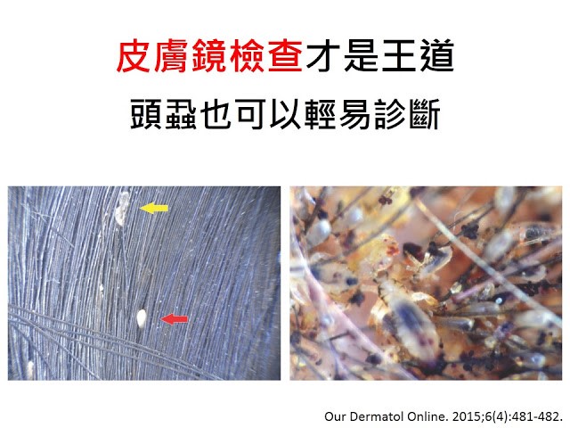 目前已經有相當多的文獻介紹使用皮膚鏡來診斷頭蝨、體蝨、陰蝨,甚至是疥蟲的感染。