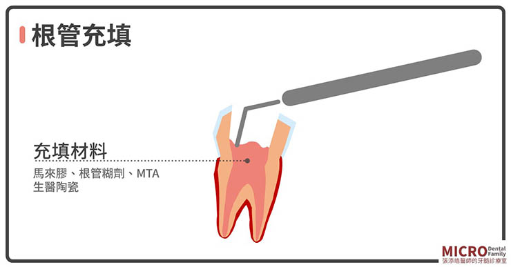 處置完後的這系統就像是一個空空的管道,我們需要利用一些材料〈馬來膠、根管糊劑、MTA、生醫陶瓷…等〉把這些空空的通道整個密封起來;這「封起來」我們可以稱之為「根管充填」。
