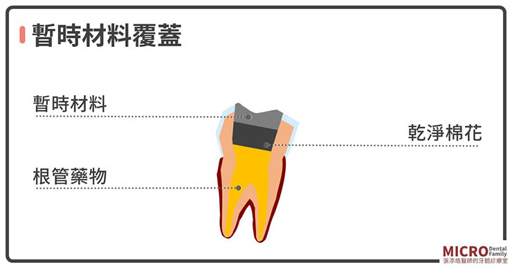 在當次治療結束後,醫師會以乾淨棉花、暫時性的材料、或臨時假牙覆蓋根管治療的開口。