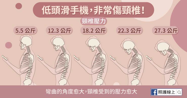 2014年美國的神經外科醫師 Kenneth Hansraj 提出的研究發現,在標準的站姿時,頭部壓在頸椎上的重量大約是5公斤。當我們低頭開始滑手機,壓在頸椎的重量就不只這樣,而且當頭越低,頸椎的負擔就越重!