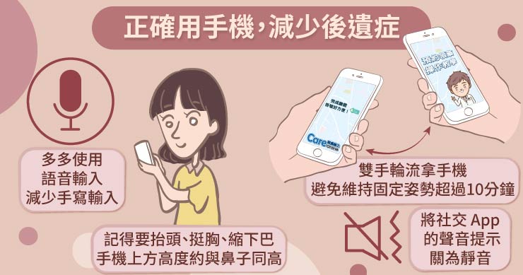 ◎ 雙手輪流拿手機,避免維持固定姿勢超過10分鐘。
