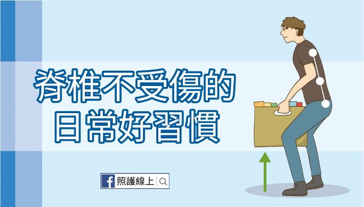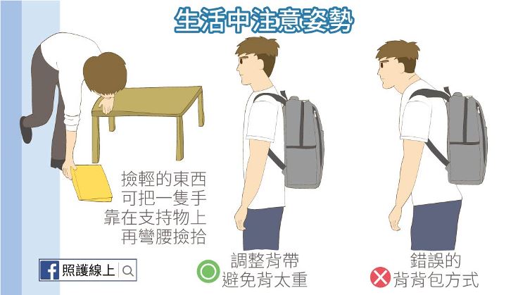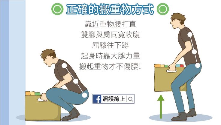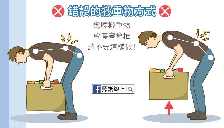 請記得,要拿重物(不管是小孩、洗衣籃、或垃圾)的時候,都盡量不彎腰,而是腰打直,靠近要抱起來的重物,雙腳打開與肩同寬,腹部收緊,屈膝往下蹲,這樣起身時抱起重物可以是靠大腿的力量。當我們借助大腿的力量提起重物時,就比較不傷脊椎。如果只是彎腰,卻沒有曲腿,脊椎的負擔就非常重。
