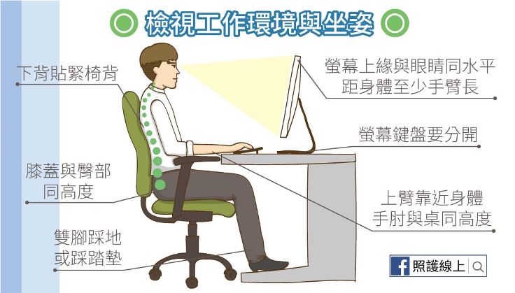 首先,我們先來看椅子怎麼選,選椅子的時候要高度適當,還要能讓你「靠腰」!當我們坐在電腦前工作時,最好要在椅子上坐好坐滿,後背直接由椅子支撐著,而膝蓋則和屁股同高度,雙腳自然踩地或踩著踏墊。選好椅子後,接下來就是考慮桌子,桌子的高度差不多是人在坐姿時的手肘高度,讓這人坐下時上臂輕鬆垂放幾乎是與地面垂直,所以差不多手肘的位置也會靠近腰部的地方。所以就按照自己適當的身高來選擇桌椅吧!像是如果腳太長沒位置放的話,就一齊升高桌子和椅子的高度。如果桌椅都比較高卻無法降低,就調整到適當的相對位置,並找個腳踏墊踩著。