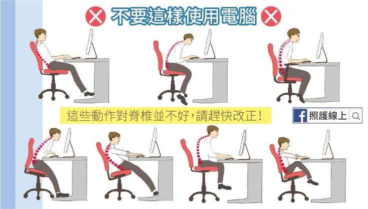 而當我們聽到「自然輕鬆」的姿勢時,可能想到的都是往前傾或往後倒這種很廢的動作,但其實愈常讓肌肉在錯誤的姿勢下過度使用,反而會帶來傷害。因此如果你的工作需要久坐,記得身體就是要坐直。讓上半身的耳朵、肩膀、臀部呈一直線,上臂靠近上半身,手肘高度雖然是桌子處,但不要讓手肘靠在太硬的地方。千萬不要懶懶散散地坐著讓屁股往前滑,或整個身體趴在桌上屁股頂在後方,這樣坐的歪七扭八的姿勢都會加重脊椎的負擔,提高後來下背痛的機會。