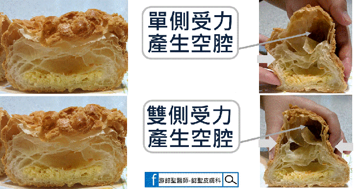 上面這段看完我想你一定還是滿臉黑人問號,我們來打個比方好了,可以把我們的皮膚想像成一塊上面是起酥、裡面有包餡的麵包,一層一層的起酥皮,就像是表皮層的結構,當我們兩邊用力壓擠麵包時,就像是皮膚表面緊貼著鞋子摩擦,會發現起酥皮之間的空間變大了,就像是皮膚表皮層內斷裂產生空腔一樣,空腔內充滿著水,就變成水皰了。