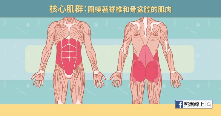 核心肌群指的是圍繞著脊椎和骨盆腔的肌肉。包括了屬於骨盆肌群的腹直肌、外斜肌、內斜肌、內斜肌、腹橫肌。背部的背直肌、腰方肌、背闊肌、多裂肌。以及髖部的臀大肌、臀中肌、和髂腰肌。所以當我們訓練核心肌群,就會讓骨盆、臀部、下背、腹部的肌肉更強健有力,這些主要肌肉群運作起來比較和諧,就能增進日常生活及運動中的穩定度和平衡。