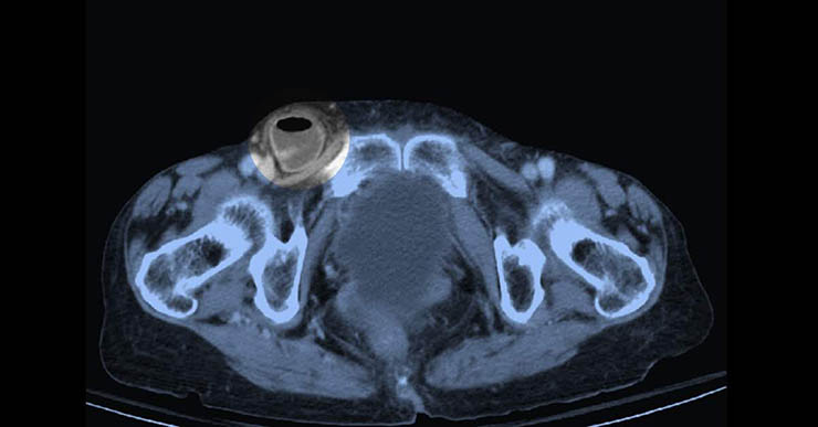 經檢視診斷為鼠蹊部嵌頓型疝氣,造成腸子卡住,於是安排緊急手術處理,所幸手術順利,腸子還沒有壞死,患者術後觀察一、二天後順利出院。