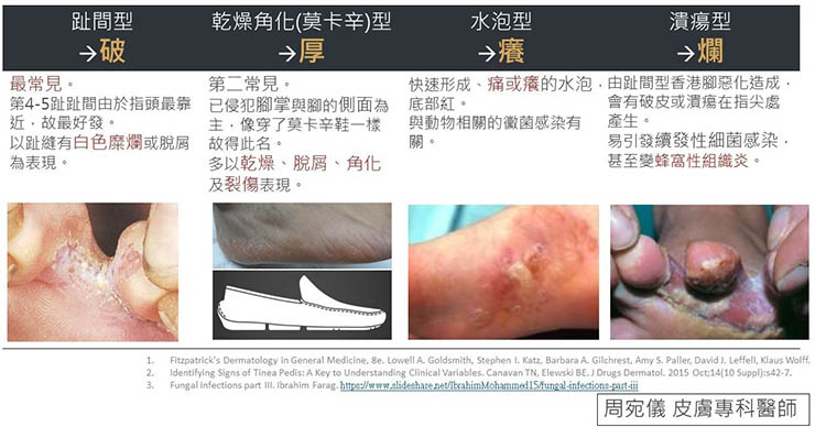 臨床上,香港腳表現可以分為破厚癢爛四大類: