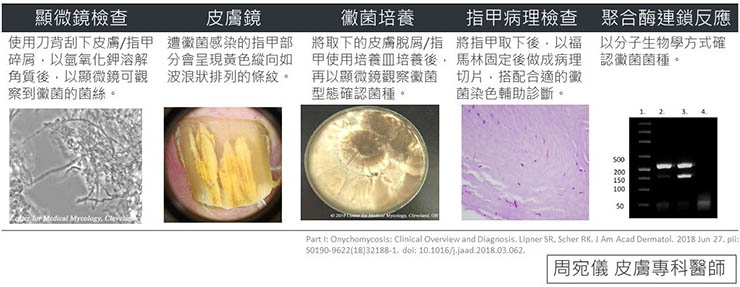 有經驗的皮膚科醫師在臨床上會根據病史與理學檢查去做指甲疾病的各種鑑別診斷。需要時會搭配檢查如下: