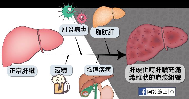 肝硬化指的是肝臟細胞被破壞時,會製作出許多疤痕組織,肝臟發炎而腫脹。無論什麼原因造成肝臟反覆受創,都會導致纖維組織增生,並破壞肝小葉裡的結構和血液循環,由於肝臟細胞被許多纖維狀的疤痕組織框住,使再生的肝臟細胞被分成一群一群的小結節,縱橫交錯的纖維組織讓肝臟變形又變硬,這就是我們所說的「肝硬化」。當疤痕組織愈來愈多,壓迫肝臟內部血管,影響運送血流的效率,正常的肝臟細胞逐漸死亡。