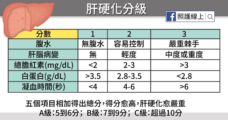 這五個項目裡得分愈高,肝硬化就愈嚴重。總分5到6分的話,是Child-Pugh A,總分7到9分屬於Child-Pugh B的範疇,阿強就是Child-Pugh B,總分超過10分的話,就是Child-Pugh C。肝硬化C級患者平均只能存活一到三年。