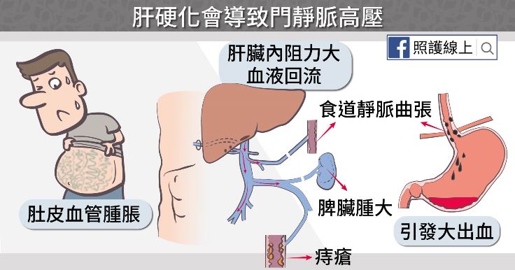 是這樣的,肝臟內充斥許多疤痕組織後,疤痕組織壓迫著靜脈,導致輸送進入肝臟的血壓需要提高。正常腸胃道血流的方向是從小腸經由門靜脈進入肝臟。然而門脈高壓而加強了血流阻力,導致血液回流,回流到到胃和食道造成靜脈膨大,形成靜脈曲張,靜脈曲張後這些靜脈管壁變得脆弱,萬一撕裂導致出血的話,血很難止住,一次會流好多血,患者大口大口吐出鮮血,甚至讓患者失血休克死亡。我們在這篇文章開頭提到的古龍先生,就是死在肝硬化引發門靜脈高壓,導致食道靜脈瘤而大出血身亡的。門靜脈高壓亦會使肚臍附近的血管會變得又鼓又脹,盤根錯節。再讓患者肛門處有痔瘡,靜脈曲張嚴重。