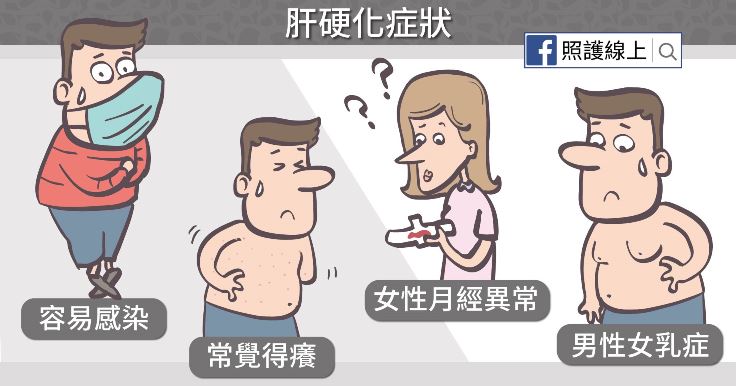 不僅如此,肝硬化後還有很多併發症狀。像是容易感染,抵抗力差,常常覺得癢,不論男女都會荷爾蒙異常,女性表現月經異常,男性則有男性女乳症、睪丸變小、陰囊變腫。肝臟不好後,連帶腎臟也會出事。因為雖然肝硬化患者腹腔積了很多腹水,但實際上血管裡的水分是不足的,腎臟機能連帶惡化,我們稱為肝腎症候群。