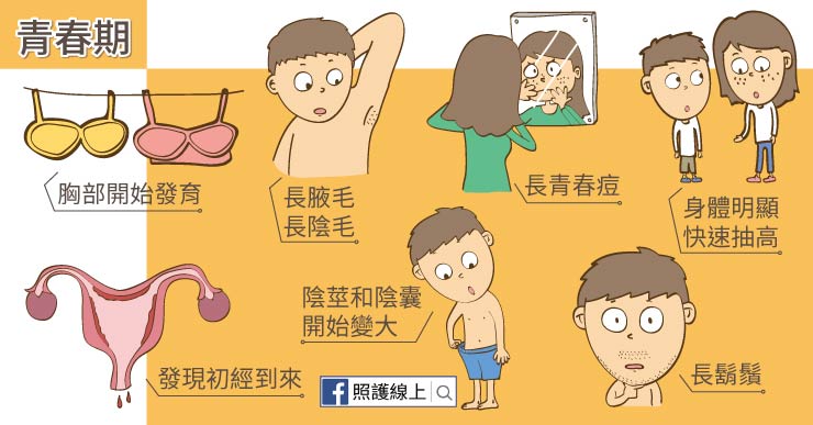 女孩大約於8到13歲會開始成長發育,男孩稍微晚一點點,大約介於9歲到14歲之間開始發育。男女生均會開始長腋毛、長陰毛、長青春痘,身體明顯快速抽高。女孩子的胸部開始發育,發現初經到來。男孩子的陰莖和陰囊開始變大,開始長鬍鬚,聲音逐漸變得低沉。