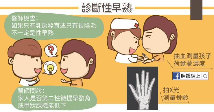 因此要提醒大家,醫師不是看到小於八歲的孩子長腋毛、或胸部正在發育,就能直接診斷性早熟。要診斷青春期提早來臨,醫師會仔細詢問小孩與其家人的過去狀況,看看是否家人曾經第二性徵提早發育,或是有甲狀腺機能低下這些問題,並做完整的身體檢查,替孩子抽血測量荷爾蒙濃度和甲狀腺機能。用X光拍照檢查手腕和手處的骨骼,判定其骨齡也是個評估孩子是否已經提早發育的好方式。多數孩子不用做到腦部的影像檢查,除非是表現第二性徵的時間點真的很早,屬於六歲以下就表現性早熟的孩子,就要考慮加做腦部檢查。如果醫師懷疑的是卵巢或睪丸處是原因所在,就要做超音波檢查卵巢或睪丸的狀況。