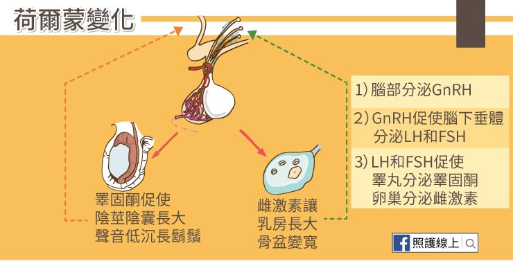 那我們再來看看,究竟大家是如何成長發育的,其實這是靠著一連串的荷爾蒙刺激影響,一層層接著下去。首先,腦部分泌促性腺激素釋放激素(gonadotropin-releasing hormone,簡寫為Gn-RH)這個名字很長的荷爾蒙,這個GnRH荷爾蒙又會去影響腦下垂體,讓腦下垂體分泌黃體化激素(luteinizing hormone,簡寫為LH)及卵泡刺激素(follicle-stimulating hormone,簡寫為FSH),LH和FSH這兩個激素會刺激卵巢和睪丸,讓女孩子的卵巢分泌雌激素,讓男孩子的睪丸分泌睪固酮,雌激素和睪固酮又分別促進了女性和男性的第二性徵發育。