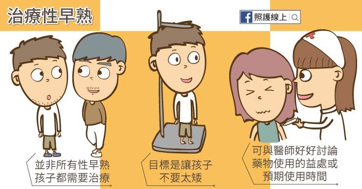 講到這裡,大家是不是看得霧颯颯呢?沒關係,我們稍微總結一下,孩子如果在八歲以前表現出胸部發育、長腋毛陰毛等狀況,要帶去讓醫師評估,看看是單純的乳房早熟而已,還是青春期已經提早到來。若確定是性早熟,醫師會試著區辨誘發性早熟的原因及性早熟的類型,作為治療方式的依據。