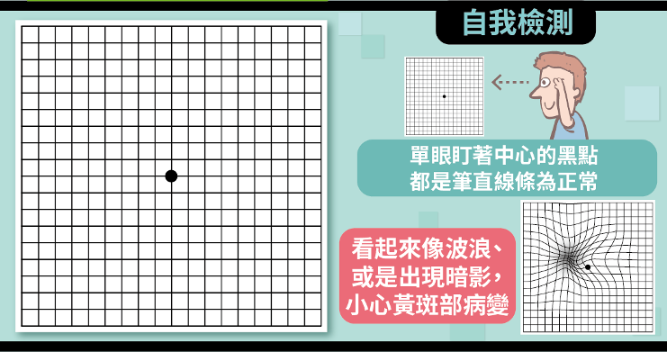 這個自我檢測的表格是阿姆斯勒方格表(Amsler grid),請各位先找個照明良好的環境,把檢測表放在眼前30公分,再「睜一隻眼、閉一隻眼」,例如遮住左眼,由右眼盯著中心的黑點做測試。平常有戴著眼鏡的人,就請戴著眼鏡做測試。如果你看到的是筆直線條,每個角落都毫無缺損,恭喜你,現在這眼是正常的,請換另一眼再做一次測試。但若你看到的線條是波浪型曲線,看起來模糊,或有幾條線不清楚不見了,哇!這可能是「黃斑部病變」的徵兆。(請使用電腦螢幕。此方法不能取代正規的眼科檢測,請定期進行眼科檢查。)