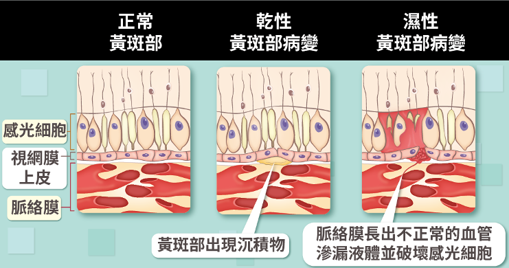 至於「濕性黃斑部病變」為什麼會被稱為「濕性」呢?原來這時黃斑部下方的脈絡膜會長出不正常的新生血管,但新生的血管並不健全,會滲漏血液、液體進到視網膜,破壞黃斑部的感光細胞,而扭曲了視覺造成視力惡化,本來筆直的線條都變成了波浪狀。新生的血管與滲漏的血液後來會讓黃斑部形成疤痕組織,患者可能在幾周到幾個月內喪失視力。