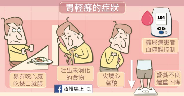 沒遇過這些問題的人會不太懂什麼是胃「動的不好」。胃輕癱的患者容易會有噁心感,還會吐出幾個小時前吃的、但尚未消化的食物,偶爾還有火燒心、溢酸感等胃食道逆流症狀。胃輕癱時,吃東西只能吃個幾口,因為很快就覺得胃脹脹的很飽了,時不時有胃痙攣的痛楚,當胃口愈來愈差,人就變得營養不良,體重持續下探。而這樣的進食狀況還會另外一個大問題,是讓糖尿病患者的血糖值更難控制,更加不穩定。