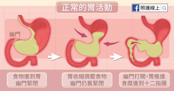 那為什麼胃會動的不好呢?我們吃東西入口後,食物依序進入食道、胃、十二指腸等消化道內,過程中消化道會用發動物理攻擊來擠壓、磨碎食物,也會發動化學攻擊來分解食物,讓雞排、飯、蘋果等食物變成混在一起的食糜,再由小腸吸收營養,由肛門排出食物殘渣。這些食物要怎麼在消化道內不斷前進呢?這可不是僅靠重力,別以為吃下一塊雞排後,雞排會咚的一聲往下掉,調到胃再掉到小腸大腸再掉出肛門。食物要在消化道裡面前進,需要靠腸胃道收縮推進,把一團一團的食物食糜往前送,而胃還設有前面的賁門和後面的幽門兩個關卡,食物進到胃裡面後,賁門幽門都會關緊,胃就不斷擠壓和用胃酸分解這些被困住食團,消化的差不多之後,幽門括約肌放鬆打開幽門,讓食團往十二指腸前進。