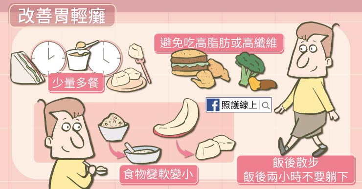 ● 飯前飯後注意:吃東西時坐直吃,餐後做點小運動,像是散步,飯後兩小時內都不要躺下來