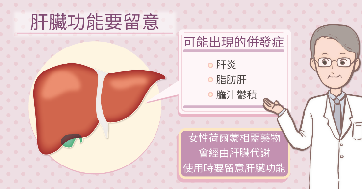 因為女性荷爾蒙相關藥物及其拮抗劑會經由肝臟代謝,少數患者可能出現肝毒性副作用。患者可能產生急性肝炎、膽汁鬱積等狀況。像我們前面提到用來治療乳癌的荷爾蒙療法可能產生脂肪肝,尤其是原本體重過重,有代謝症候群的患者更容易產生肝臟問題。