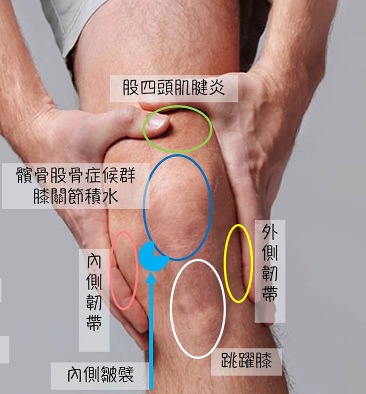 (簡單來說,是膝蓋的正前方痛,也就是髕骨股骨症候群的區域。圖片來源:堡醫師的運動傷害診療室)