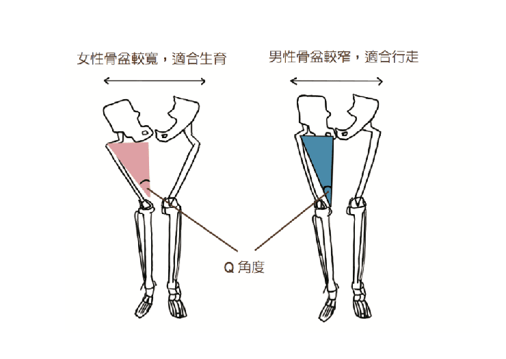 包括女性、跑者、體重過重者。女性因天生骨盆結構較寬(適合生育),大腿骨角度較斜,與小腿骨形成的夾角(Q角度)就會變得很大,這種狀況下,較容易使髕骨往外位移,造成軟骨磨損。女性骨盆較寬,髕骨角度易過大而外翻,屬於女性先天劣勢。
