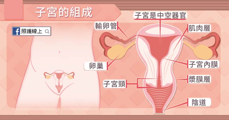 子宮是個中空的器官,裡頭的空間正是保留給胎兒的小皇宮,為了讓胎兒從好小好小的體積,長大到大約三公斤、身長四五十公分的嬰兒,我們的子宮擁有極好的延展性。子宮的組成可分成三層,最內層稱為「子宮內膜」;最外層稱為「漿膜層」;中間則是有強壯、厚實的肌肉層。接近媽媽要自然生產的時候,子宮強力收縮造成陣痛,就是由這肌肉層收縮引發的,要從媽媽肚子中擠出胎兒,也是要靠這層子宮肌肉的強力收縮才行。