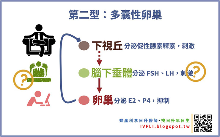 第二型:多囊性卵巢( Eugonadotrophic eugonadism )( PCO )(老闆指令有問題,員工不知道該如何工作)(解除模式:排卵藥、排卵針)