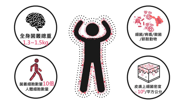 人體微生物菌落會存在皮膚表面和身體內。一個成人,有高達一兆隻的細菌,總重為1.3-1.5公斤,約為人腦的重量,同時是我們整個人體細胞的10倍量,所以我們應該不是人,而是一個行走的細菌(Walking bacteria)。