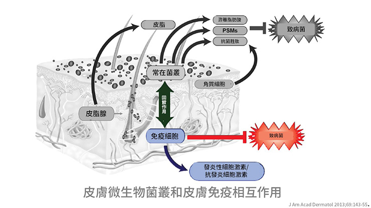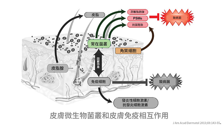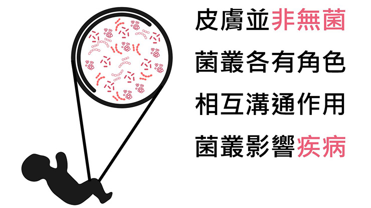 常在菌叢可以抑制致病菌叢的生殖,減少皮膚疾病產生,維持皮膚菌叢平衡對於皮膚正常生理功能是相當重要的。