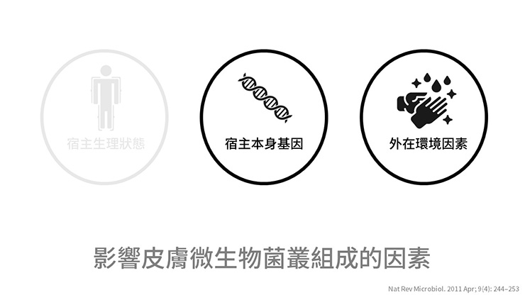 除了皮膚生理環境外,基因對我們的菌叢組成也有影響。