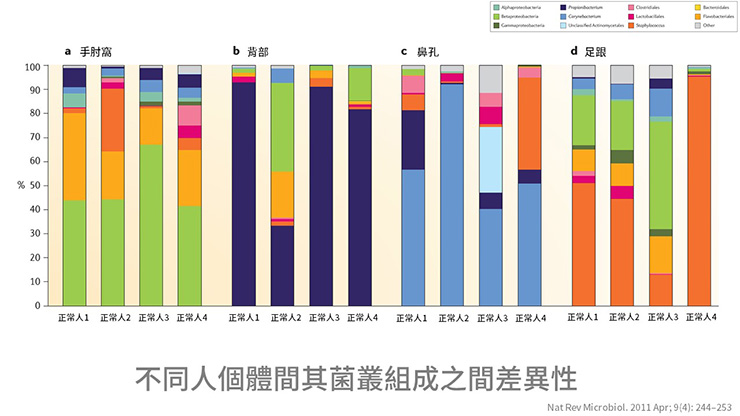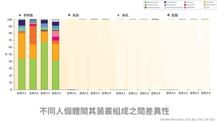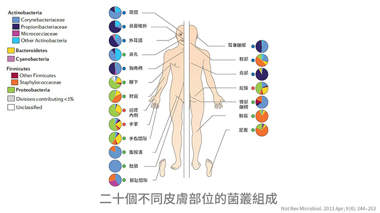 2007年美國人體基因體計畫,調查242個正常健康人的菌叢,皮膚部分總共分析20個部位,結果發現每個部位皮膚菌叢組成皆不太相同。