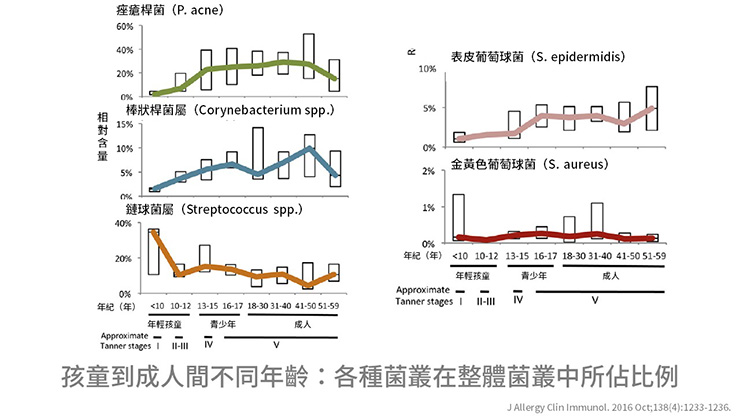 另外,皮膚菌叢中的一個常在菌-表皮葡萄球菌(S. epidermidis)則隨年紀增加。