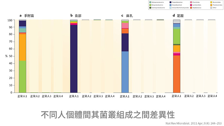 另外,我們檢查不同的人也發現到,同一部位,在不同人之間,菌叢組成相似。