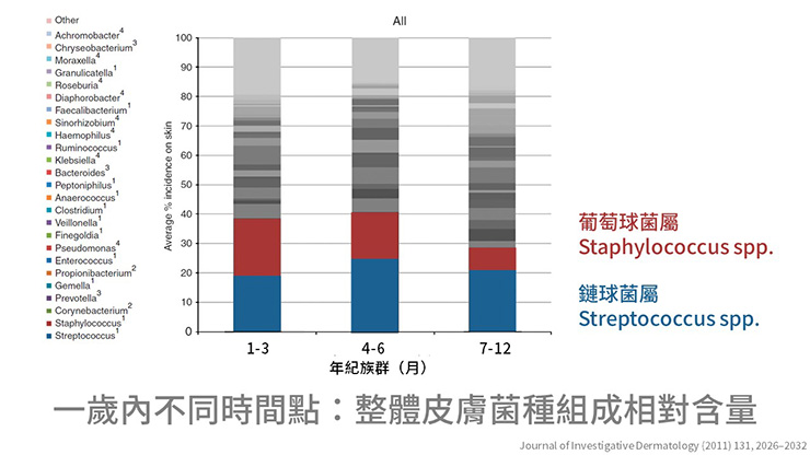隨著嬰兒年紀越大,到7-12個月大時,葡萄球菌屬(Staphylococcus spp.)和鏈球菌屬(Streptococcus spp.)會顯著減少,其他菌叢則會增加,這解釋了皮膚微生物菌叢的發展和差異性。