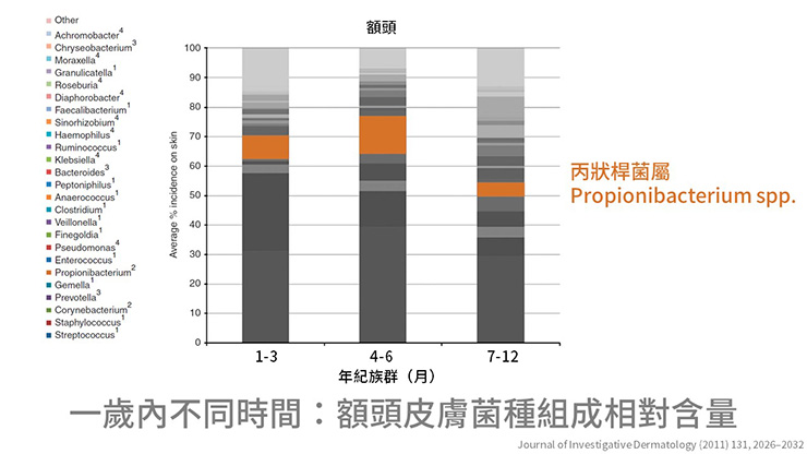 本研究也發現,嬰幼兒4-6個月大時,額頭部位的丙酸桿菌屬(Propionibacteria spp.)會突然間大量增加,而這段時間正是嬰幼兒痘痘好發的年紀,可見皮膚菌叢和皮膚疾病有相關性。