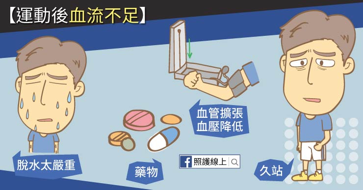 有些人平常沒有心血管問題,但做運動時做得太操,收操時過於突然!我們運動時身體增加循環,讓心跳速度加快,血管呈現擴張的狀態;如果突然停止運動,我們的心跳速度變慢,但血管還是擴張的,這時血壓會下降。通常運動後三十到六十分鐘時,血壓是比較低的,容易讓人因而感到頭暈,若此時又伴隨脫水太嚴重,血壓會掉得更快。