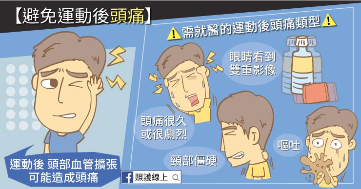 但如果你年紀已經超過40歲,突然在運動後頭痛,而且不是痛一下就結束,而是痛了好幾個小時,甚至還有其他症狀,像是頸部僵硬,眼睛看到雙重影像,或伴隨著嘔吐,就要小心,就醫找出原因,看是否要做影像檢查。