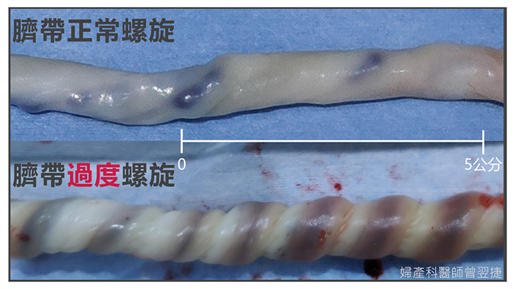 臍帶的結構一般包含了 2 條臍動脈, 1 條臍靜脈,以及包圍在血管周遭的豐厚結締組織。由於結締組織富含彈性,因此能確保臍帶血流不受胎兒肢體的壓迫而中斷。然而,當有臍帶過長或過短,多圈纏繞,打結,脫垂,或是過度螺旋等狀況發生時,臍帶血流仍有可能因此受阻,而造成胎兒的死傷,一般稱之為「臍帶意外」。其中,臍帶過度螺旋是最難診斷的臍帶意外之一。一旦發生,不僅胎兒窒息的風險將上升為四倍,胎兒體重過輕的風險也將上升兩倍。據統計,臍帶意外約占死產原因的 5~10% 。
