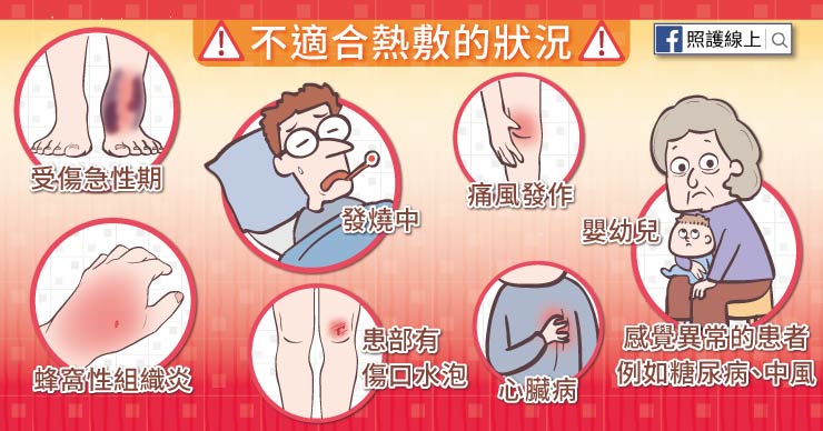糖尿病患者的血糖高會導致神經病變,對溫度感覺較遲鈍,自行準備熱毛巾、泡澡、泡溫泉都容易因為感覺遲鈍而燙傷皮膚。可以考慮使用具有溫度控制、定時裝置的熱敷器材,並按照說明操作產品,才不至於破壞皮膚。中風、感覺異常的患者若想熱敷,務必要向專業醫護人員諮詢。